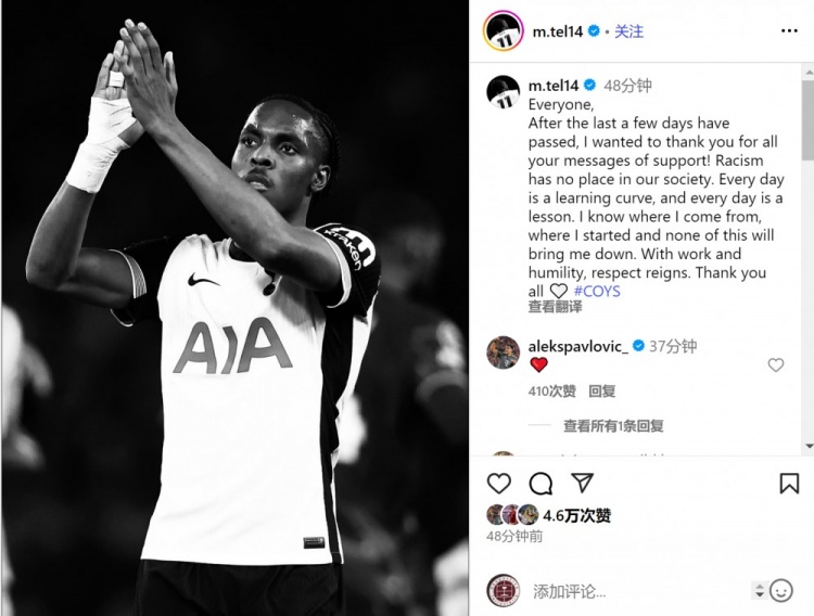 特尔在社交媒体上写道:“大家好,我想感谢你们过去几天里的所有支持信息!种族主义在我们社会中没有立足之地。每一天都是一个学习的过程,每一天都是一堂课。我知道自己来自哪里,从哪里开始,这些都不会让我退缩。通过努力和谦逊,尊重将占据主导。感谢大家,加油热刺!”